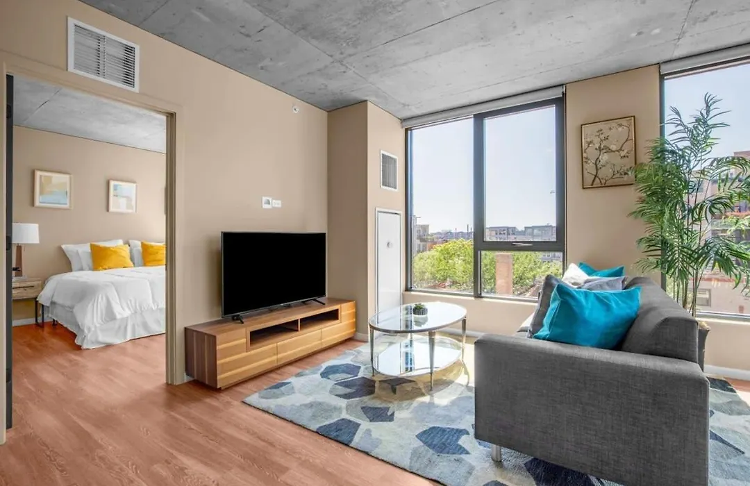 Along with tea and coffee making equipment, this apartment boasts a fully-fitted kitchen featuring a refrigerator, an oven, and kitchenware. Midway International airport is at a 16-minute driving distance, and Madison & Peoria bus stop is within a short walking distance of the apartment. Access to fitness classes allows guests to add variety to their leisure. After a day full of activities, relaxing by an outdoor pool is a perfect option.